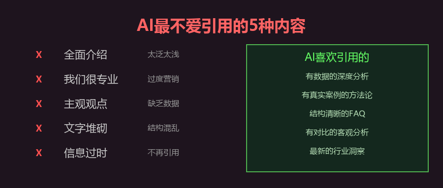 泛泛的”全面介绍”、纯宣传的”我们很专业”、没有数据的”主观观点”、结构混乱的”文字堆砌”、信息过时的”老内容”——这5种内容,写得再多,AI也不会引用。