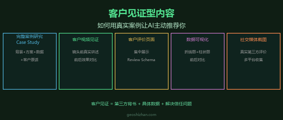 因为客户见证 = 第三方背书 = 可信度高 = AI引用的最佳素材。