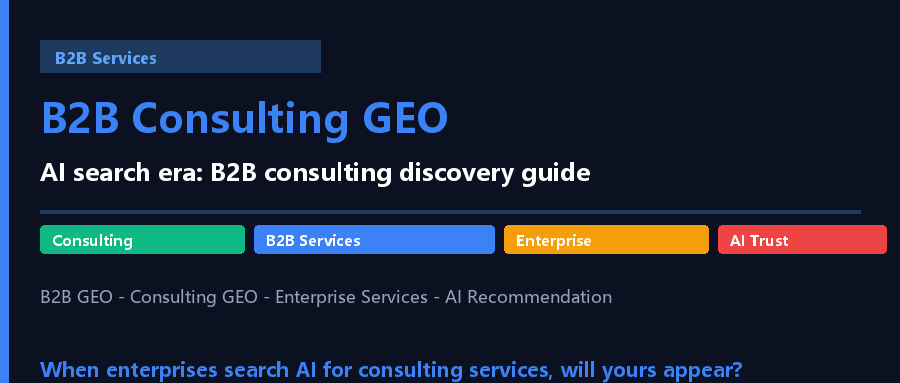 深度解析B2B咨询服务(战略咨询/管理咨询/IT咨询/财务咨询)的GEO专项攻略:B2B咨询GEO的特殊机会(企业决策需求/专业内容建立权威)、内容策略(行业洞察/案例分享)、个人品牌GEO和行动清单。