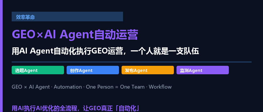 - GEO的核心工作(选题、创作、发布、监测)都可以由AI Agent自动化执行