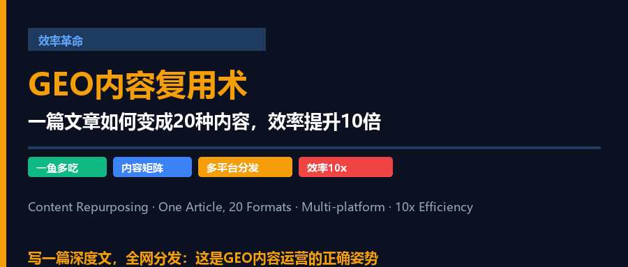 GEO的核心不是「写很多篇文章」,而是「把每篇文章的价值最大化」——一篇高质量的GEO文章,可以变成20种不同的内容形式,分发到10个以上的平台,让你的内容效率提升10倍。