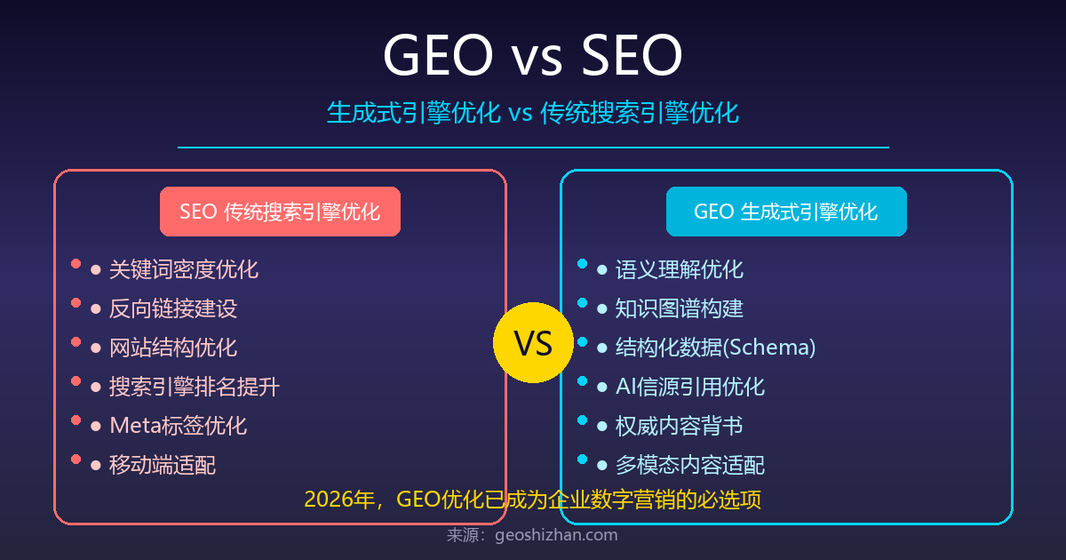 图:GEO vs SEO 2026 对比解析 | 来源:geoshizhan.com