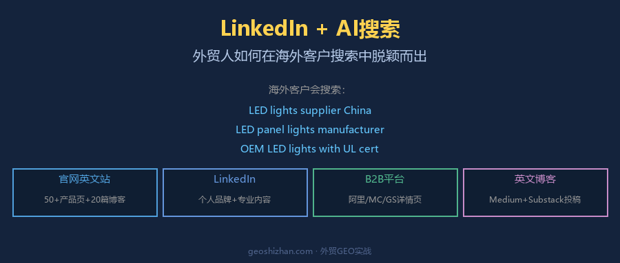 当海外采购商用AI搜索”LED lights supplier China”,LinkedIn的内容几乎不会被引用——因为AI的数据库里,LinkedIn的权重远不如专业内容平台。