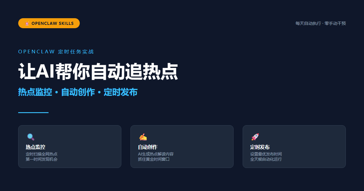 OpenClaw定时任务让热点追踪自动化:AI24小时监控热点、自动生成内容、在最佳时间发布。